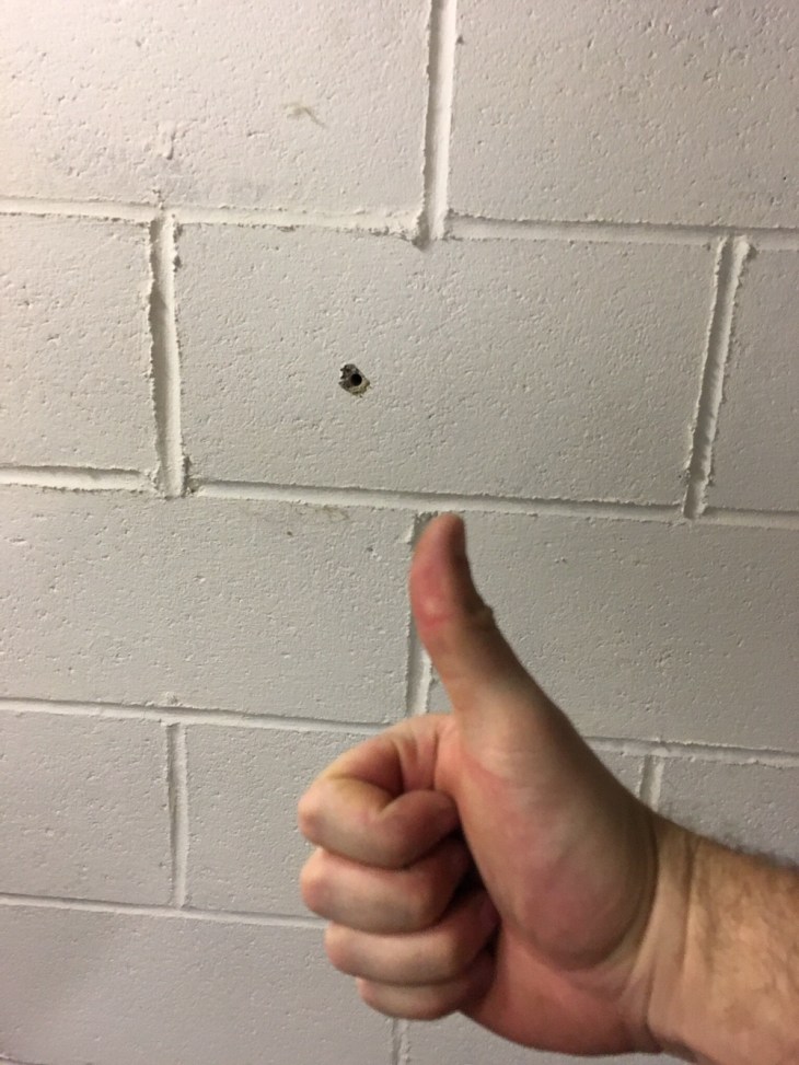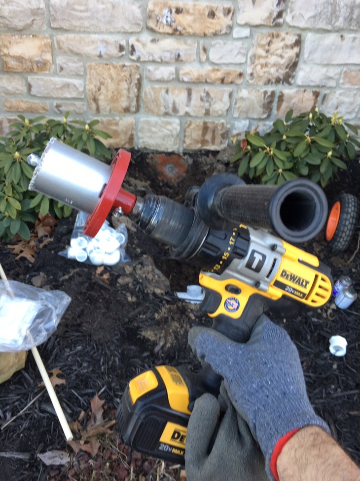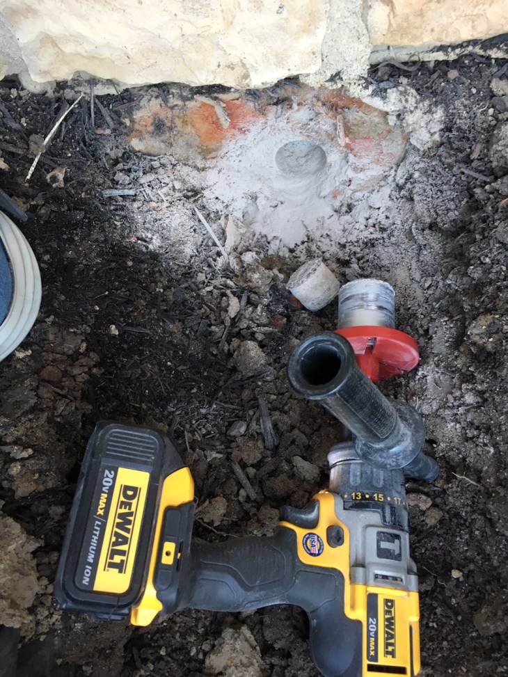 Nice and slow drilling with a higher powered Dewalt drill. Occasionally I had to chisel out a little bit of the concrete. Eventually I hit it from both sides using the guide hole as reference. I also purchased the concrete drill bits 12″ variety pack from Harbor Freight that worked with my drill even tho they were SDS bits.
