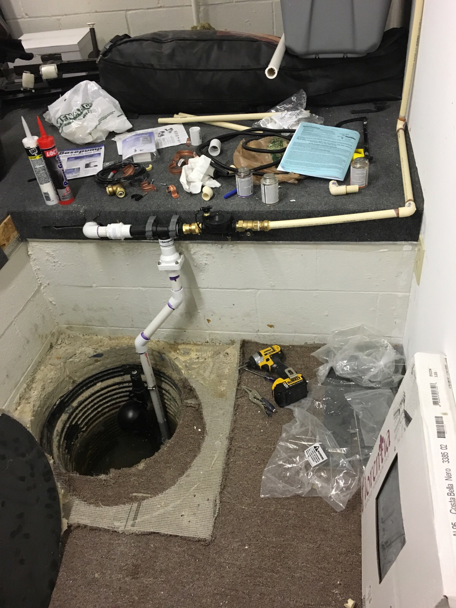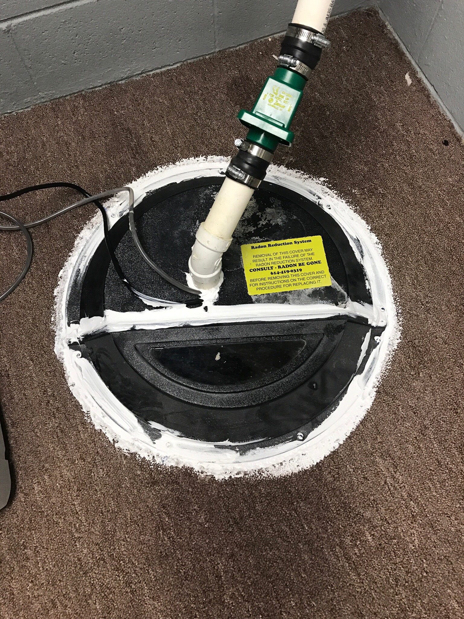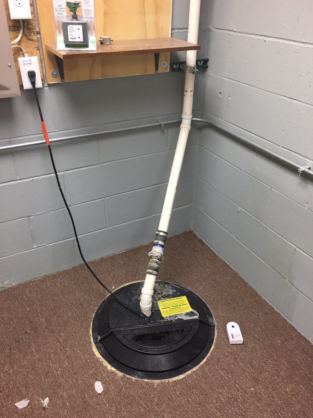 In this last picture I have everything back together and I used some extra caulk I had to seal the radon cover back (go buy clear or black if you need to do this, I don’t recommend white – ha ha). Before you get to this stage make sure you test it multiple times using a 5 gallon bucket to fill the reservoir. You’re looking to make sure all the seals are secure (no leaks exist), and that the unit is being triggered by the rising water level. The float switch on each unit is a little different, so make sure it’s not obstructed. If no issues exist, you’re done! For my job it may have been an hour swap, the radon cover being the most time consuming part.