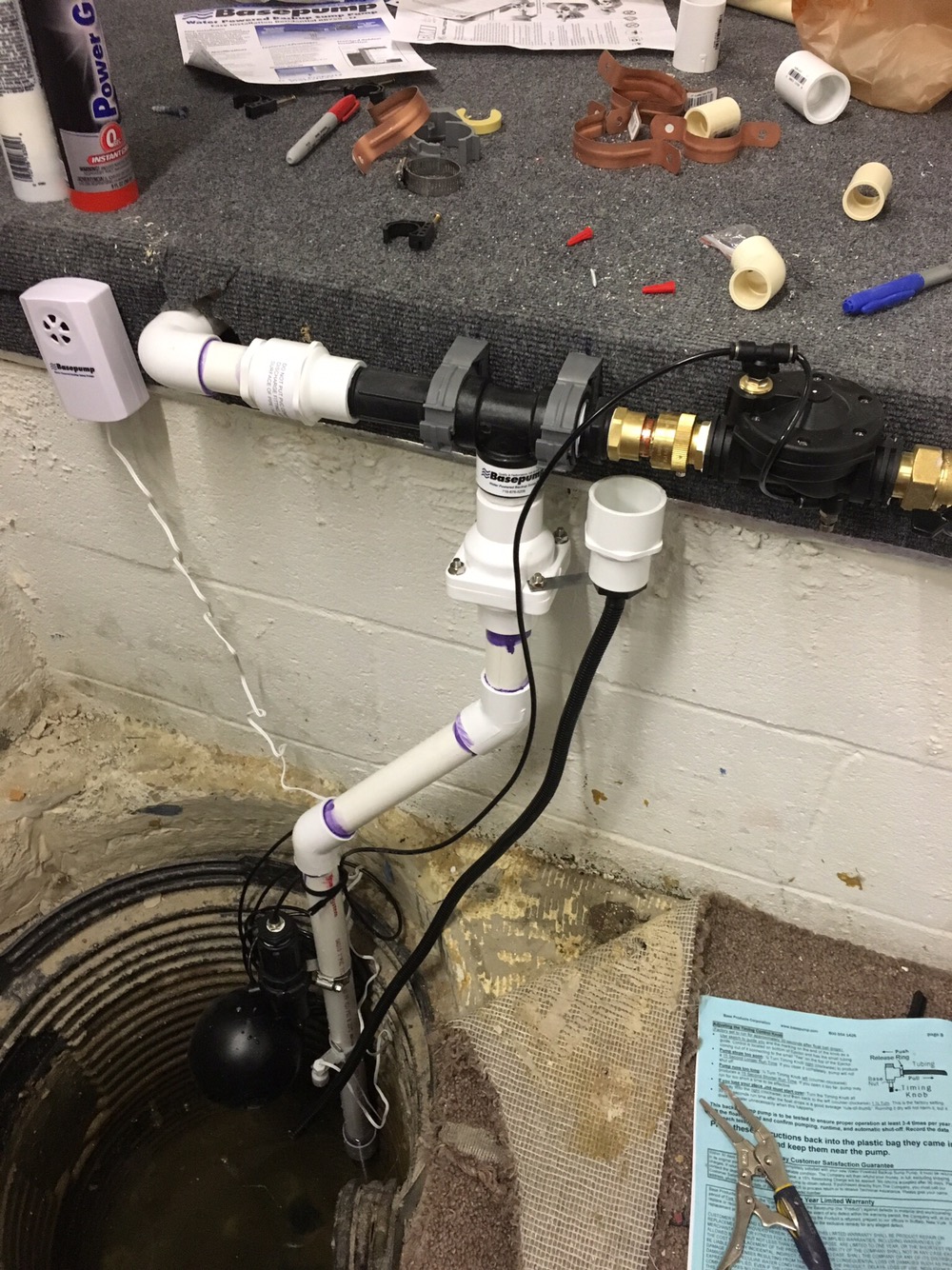 The last option, and what I went with with, was a water powered sump pump. My basement at the time was unfinished so I had access to the water pipes in the ceiling. I also wanted to leverage the second well at the other corner of the basement, which was able to access water lines easily.