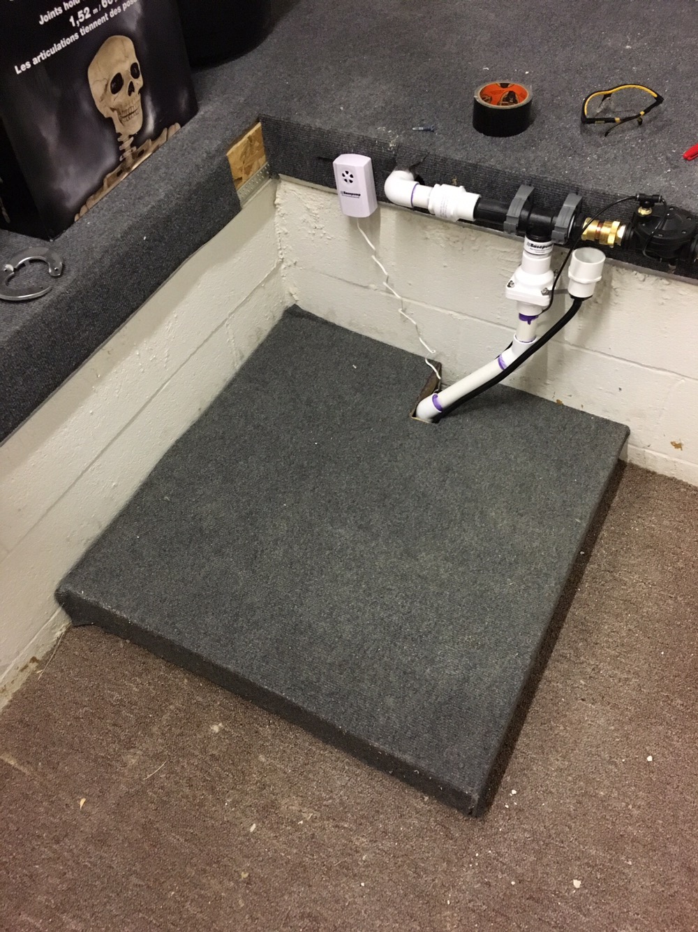 As you can see I took a variety of steps to seal the well and protect it from getting stepped on since this is a fairly high traffic area. I also installed the water level sensor that came with the unit. The idea is if this unit is triggered, an alarm will go off letting the homeowner know the primary sump pump has failed. I rigged the water sensor a couple inches higher than the other primary sump pump so this model will only run in emergency situations.