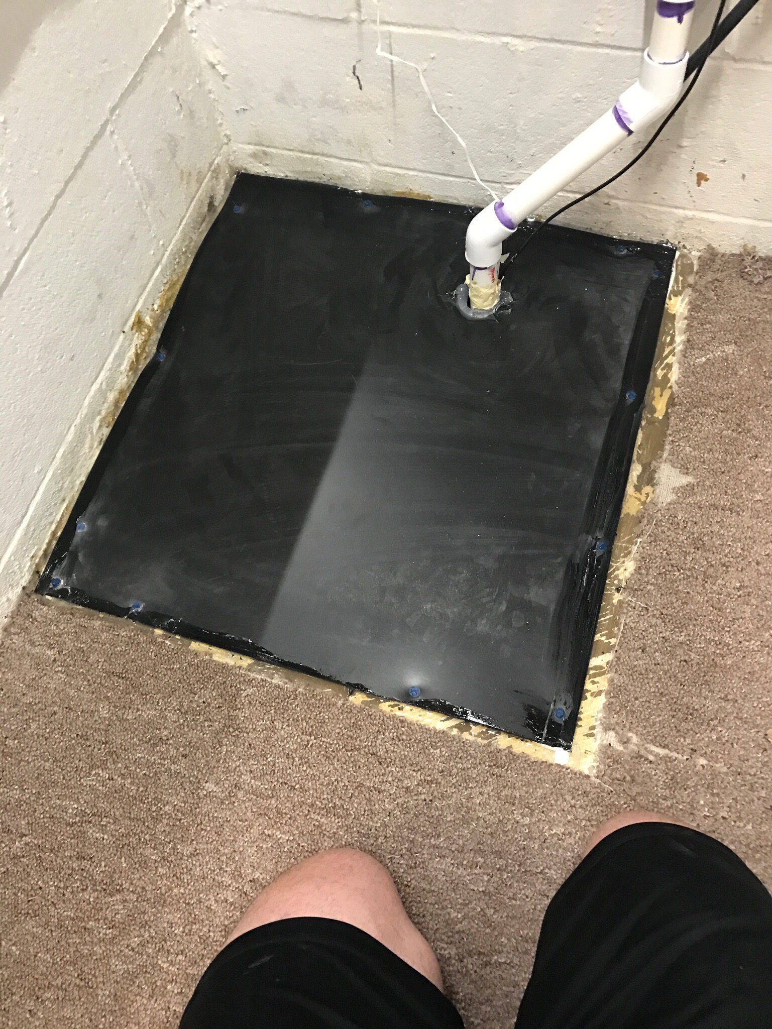 I was able to purchase some Solid Black Hi-Density Polyethylene from Menard’s and cut it to replace the old radon cover. Sealed it with a clear chalk.