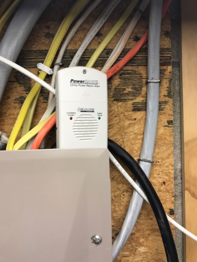 Below is the PowerBack! device. This is an alarm that you setup at your fuse box. And it has a cord that wraps around the power line that comes IN to your fuse box from the exterior powerline. The alarm will go off when power has been restored to the house. This will be the indicator you use to say “Awesome, power is back. Let me turn off my generator and switch things back over.” You only turn this device on when you’re using your generator, otherwise it remains off.