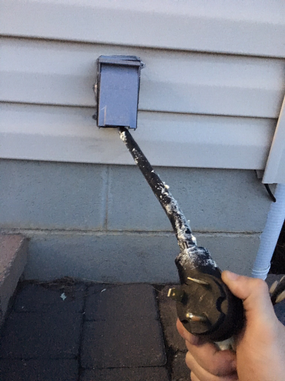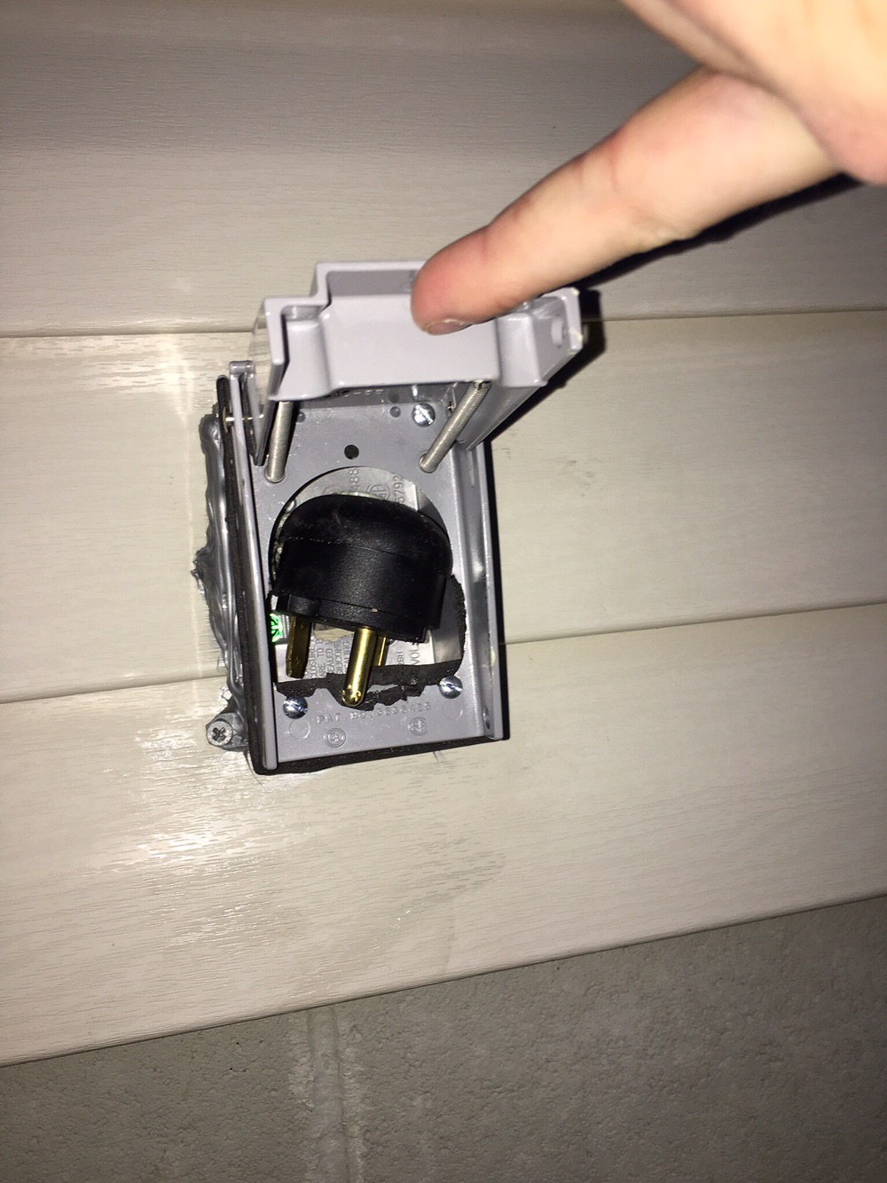 I couldn’t find a outlet with an opening large enough to house the “plug” head at my local hardware store, so I used a hole drill to make it a little bigger so that I could close the cover when not in use. I used some exterior chalk to cover the seam connecting it to the house making it water tight. I also used insulation on the inside such as spray foam to protect the house from the elements. You’ll see a little spray foam residue on the power line.